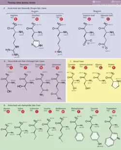 In proteins, which are composed of amino acid residues, the side chains are attached to the alpha-carbon atoms of the amide backbone. The side chain connected to the alpha-carbon is specific for each amino acid and is responsible for determining charge and polarity of the amino acid. The amino acid side chains are also responsible for many of the interactions that lead to proper protein folding and function.[5] Amino acids with similar polarity are usually attracted to each other, while nonpolar and polar side chains usually repel each other. Nonpolar/polar interactions can still play an important part in stabilizing the secondary structure due to the relatively large amount of them occurring throughout the protein.[6] Spatial positions of side-chain atoms can be predicted based on protein backbone geometry using computational tools for side-chain reconstruction.[7]