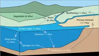 Silicon isotope biogeochemistry is the study of environmental processes using the relative abundance of Si isotopes. As the relative abundance of Si stable isotopes varies among different natural materials,[2] the differences in abundance can be used to trace the source of Si, and to study biological, geological, and chemical processes.[1] The study of stable isotope biogeochemistry of Si aims to quantify the different Si fluxes in the global biogeochemical silicon cycle, to understand the role of biogenic silica within the global Si cycle, and to investigate the applications and limitations of the sedimentary Si record as an environmental and palaeoceanographic proxy.[1]