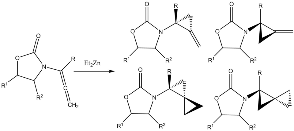 A Furukawa-modified Simmons–Smith reaction cyclopropanates both double bonds in an allenamide to form amido-spiro [2.2] cyclopentanes, featuring two cyclopropyl rings which share one carbon. The product of monocyclopropanation is also formed.[38][39]