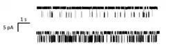 As in the case of single molecule fluorescence spectroscopy, the technique known as single channel recording can be used to obtain specific kinetic information—in this case about ion channel function—that is not available when ensemble recording, such as whole-cell recording, is performed.[9] Specifically, ion channels alternate between conducting and non-conducting classes, which differ in conformation. Therefore, the functional state of ion channels can be directly measured with sufficiently sensitive electronics, provided that proper precautions are taken to minimize noise. In turn, each of these classes may be divided into one or more kinetic states with direct bearing on the underlying function of the ion channel. Performing these types of single molecule studies under systematically varying conditions (e.g. agonist concentration and structure, permeant ion and/or channel blocker, mutations in the ion channel amino acids), can provide information regarding the interconversion of various kinetic states of the ion channel.[10] In a minimal model for an ion channel, there are two states: open and closed. However, other states are often needed in order to accurately represent the data, including multiple closed states as well as inactive and/or desensitized states, which are non-conducting states that can occur even in the presence of stimulus.[9]