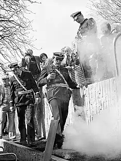 A police officer kicks a smoke bomb in Malmö in 1985.