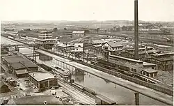 In 1861, Belgian industrial chemist Ernest Solvay turned his attention to the problem; he was apparently largely unaware of the extensive earlier work.[8] His solution was a 24 m (79 ft) gas absorption tower in which carbon dioxide bubbled up through a descending flow of brine. This, together with efficient recovery and recycling of the ammonia, proved effective. By 1864 Solvay and his brother Alfred had acquired financial backing and constructed a plant in Couillet, today a suburb of the Belgian town of Charleroi. The new process proved more economical and less polluting than the Leblanc method, and its use spread. In 1874, the Solvays expanded their facilities with a new, larger plant at Nancy, France.