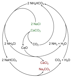 The actual implementation of this global, overall reaction is intricate.[10][11][12] A simplified description can be given using the four different, interacting chemical reactions illustrated in the figure. In the first step in the process, carbon dioxide (CO2) passes through a concentrated aqueous solution of sodium chloride (table salt, NaCl) and ammonia (NH3).