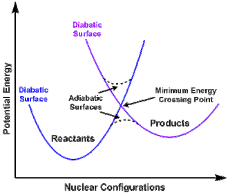 Spin-forbidden reactions formally fall into the category of electronically non-adiabatic reactions.[5] In general, potential energy surfaces fall into either the adiabatic and diabatic classification. Potential Energy Surfaces that are adiabatic rely on the use of the full electronic Hamiltonian, which includes the spin-orbit term. Those that are diabatic are likewise derived by solving the eigenvalues of the Schrödinger equation, but in this case one or more terms are omitted.[1]