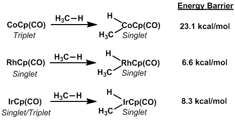 Insertion into C-H bonds, known as C-H activation, is an integral first step in C-H functionalization.[7] For some metal complexes with identical ligands, C-H activation is rapid when one metal is used and slow when other metals are used, often first row transition metals, due to the spin allowed nature of the former case and the spin-forbidden nature of the latter case. The difference in rates of C-H activation of methane for CoCp(CO), RhCp(CO), and IrCp(CO) readily demonstrate this property. CoCp(CO), the starting material in a C-H activation, exists in a triplet spin state while RhCp(CO) exists in a singlet state, with the triplet state only 5.9 kcal/mol away. IrCp(CO) is unique among these complexes in that its starting state is essentially degenerate between the triplet and singlet states. The given product of C-H insertion, CpMH(CO)(CH3), where M = Co, Rh, Ir, is in a singlet state meaning that the C-H activation with CoCp(CO) must reach the minimum energy crossing point for the reactant and product's potential energy surfaces, thus requiring relatively high energies to proceed.[8]