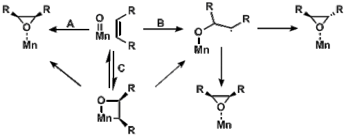 Metal-oxo species, due to their small spatial extent of metal-centered d orbitals leading to weak bonding, often have similar energies for both the low spin () and high spin configuration ().[9] This similarity in energy between the low- and high spin configurations of oxo-species lends itself to the study of spin-forbidden reactions, such as Mn(salen)-catalyzed epoxidation. The Mn(salen)-oxo species can exist in either a triplet or quintet state. While the product of the quintet lies at a lower energy, both the triplet and quintet products can be observed.[10]
