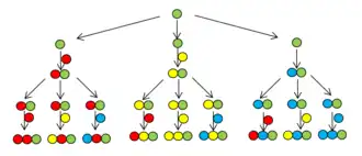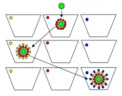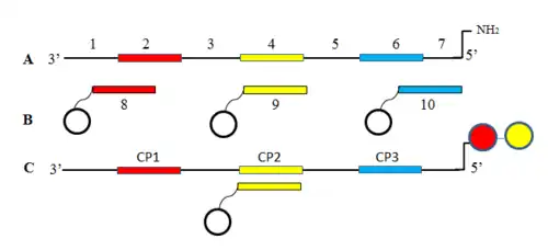 Harbury and Halpin developed DNA template libraries that direct like genes the synthesis of DNA encoded organic libraries.[22][23] The members of the template combinatorial library contain the codes of all BBs and their order of couplings. The figure shows one member of a simple ssDNA template library (A) containing the codes of three BBs (2, 4, 6) that planned to be successively attached. The coding regions are separated by the same non-coding regions (1, 3, 5, 7) in all members. The sequence directed procedure uses a series of columns of resin beads each coated with the anticodon of one of the BBs (B). When the template library is transferred to an anticodon column the proper template member is captured by hybridization then is coupled with the appropriate BB. After finished with all anticodon columns of a coupling position (CP) the libraries are eluted from the beads of the anticodon columns mixed and the mentioned operations are repeated with the series of anticodon columns of the next CP. In figure, C shows one member of the template library captured by the “yellow” second CP anticodon library. The template contains the “red” BB already coupled in CP1 and the “yellow” BB attached after its capture. The final library contains all of the synthesized organic compounds attached to their encoding DNA oligomers.