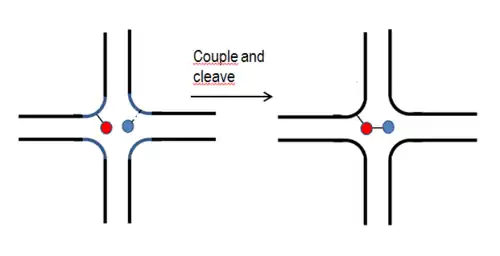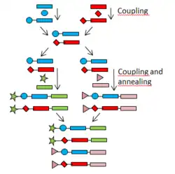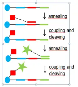 In the synthesis of DNA templated combinatorial libraries, the ability of the DNA double helix to direct region-specific chemical reactions is harnessed by Gartner et al.[19][20] The DNA- linked reagents are kept in close proximity. This is equivalent to the virtual increase of local concentration that is nearly constant within a distance of 30 nucleotides. The proximity effect helps reactions to proceed. Two libraries are synthesized. A template library containing at one end one of the BBs and its code followed by two annealing regions for the codes of the BBs of the two reagent libraries. Each of the two reagent libraries contains a coding oligonucleotide linked with cleavable bonds to the reagent (BB) capable of forming a bond with the already linked BB taking advantage of the proximity effect. The synthesis is realized in two steps as shown in the figure. Each step has three operations: mixing, annealing, coupling-cleaving.
