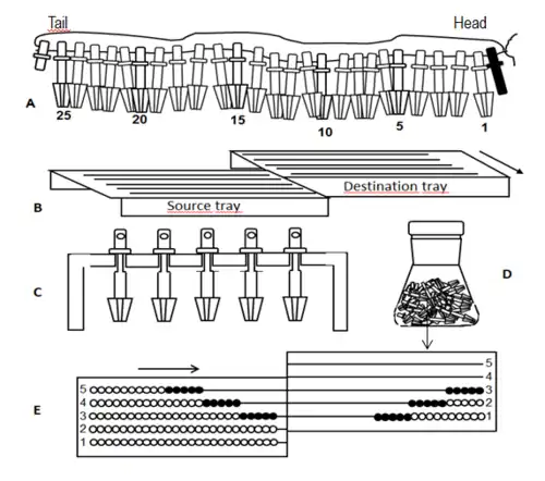 The stringed crowns and the trays used in manual sorting are shown in the figure. The destination tray is moved step by step in the direction of the arrow. The crowns are transferred in groups from the slots of the source tray into the all opposite slots of the destination tray. The transfers are directed by computer and the products are identified by the positions of the crowns occupied on the final strings. A fast automatic sorter machine had also been described.[30] The sorter is outlined in the figure. It has two sets of aligned tubes. The lower ones are step by step moving in the direction showed by the arrow and the coin-like units are dropped from the upper source tubes into the lower destination ones. The tubes may serve as reaction vessels too. A software had also been developed that can direct sorting if not a full combinatorial library is synthesized only a set of its components are prepared that are picked out from the full library.[31]