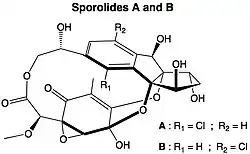 - ↑ Buchanan, Greg O.; Williams, Philip G.; Feling, Robert H.; Kauffman, Christopher A.; Jensen, Paul R.; Fenical, William (2005). "Sporolides a and b: Structurally Unprecedented Halogenated Macrolides from the Marine Actinomycete Salinisporatropica". Organic Letters. 7 (13): 2731–2734. doi:10.1021/ol050901i. PMID 15957933.
