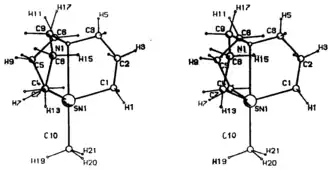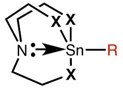 - ↑ Jurkschat, K.; Tszchach, A.; Meunier-Piret, J. (1986). "Crystal and molecular structure of 1-AZA-5-STANNA-5-methyltricyclo[3.3.3.01,5]undecane. Evidence for a transannular donor−acceptor interaction in a tetraorganotin compound". Journal of Organometallic Chemistry. 315: 45–49. doi:10.1016/0022-328X(86)80409-0.