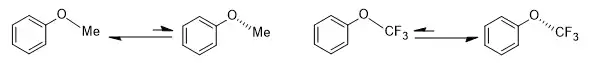 Stereoelectronic effects can have a significant influence in pharmaceutical research. Generally, the substitution of hydrogen by fluorine could be regarded as a way to tune both the hydrophobicity and the metabolic stability of a drug candidate. Moreover, it can have a profound influence on conformations, often due to stereoelectronic effects, in addition to normal steric effects resulting from the larger size of the fluorine atom. For instance, the ground state geometries of anisole (methoxybenzene) and (trifluoromethoxy)benzene differ dramatically. In anisole, the methyl group prefers to be coplanar with the phenyl group, while (trifluoromethoxy)benzene favors a geometry in which the [C(aryl)–C(aryl)–O–C(F3)] dihedral angle is around 90°. In other words, the O–CF3 bond is perpendicular to the plane of the phenyl group.[11]