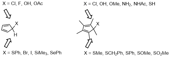In the asymmetric Diels–Alder reactions, instead of using chiral ligands or chiral auxiliaries to differentiate the side selectivity of the dienolphiles, the differentiation of face selectivity of the dienes (especially for cyclopentadiene derivatives) using stereoelectronic effects have been reported by Woodward since 1955.[19] A systematic research of facial selectivity using substituted cyclopentadiene or permethylcyclopentadiene derivatives have been conducted and the results can be listed as below.[20]
