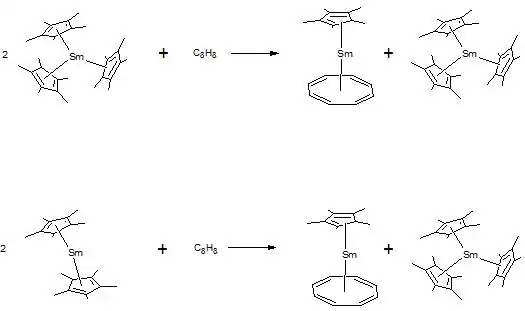 But ligand induced reductions are not new and have been known to happen with a variety of lanthanide complexes. However, steric factors must also be considered on the reactivity of the Sm(III) complex as less crowded structures do not have any reductive activity. For years, it was thought that (C5Me5)3Sm was not a possible compound due to the huge strain of cone angles greater than 120 degrees. However, this compound is formed from the Sm(II) complex, and X-Ray structures of the Sm(II) complex have shown that there was enough room for a third spot. Also, X-ray structures of (C5Me5)3Sm show that the C5Me5s are 0.1 Angstroms farther from the metal than normally predicted and expected. This increased distance, forced by sterics, makes the ligands have less electronic stability and may be a possible reason for the observed redox reaction of the ligands instead of the metal.[1]