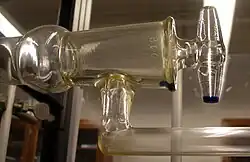 Stopcocks are often parts of laboratory glassware such as burettes, separatory funnels, Schlenk flasks, and columns used for column chromatography. The stopcock is a smooth tampered plug or rotor with a handle, which fits into a corresponding ground glass female joint. The stationary female joint is designed such that it joins two or more pieces of glass tubing. The stopcock has holes bored through it which allow the tubes attached to the female joint to be connected or separated with partial turns of the stopcock. Most stopcocks are solid pieces with linear bores although some are hollow with holes to simple holes that can line up the joints tubing. The stopcock is held together with the female joint with a metal spring, plastic plug retainer, a washer and nut system, or in some cases vacuum. Stopcocks plugs are generally made out of ground glass or an inert plastic like PTFE. The ground glass stopcocks are greased to create an airtight seal and prevent the glass from fusing. The plastic stopcocks are at most lightly oiled.[3]