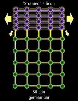 Strained silicon is a layer of silicon in which the silicon atoms are stretched beyond their normal interatomic distance.[1] This can be accomplished by putting the layer of silicon over a substrate of silicon–germanium (SiGe). As the atoms in the silicon layer align with the atoms of the underlying silicon germanium layer (which are arranged a little further apart, with respect to those of a bulk silicon crystal), the links between the silicon atoms become stretched, thereby leading to strained silicon. Moving these silicon atoms further apart reduces the atomic forces that interfere with the movement of electrons through the transistors and thus improved mobility, resulting in better chip performance and lower energy consumption. These electrons can move 70% faster allowing strained silicon transistors to switch 35% faster.