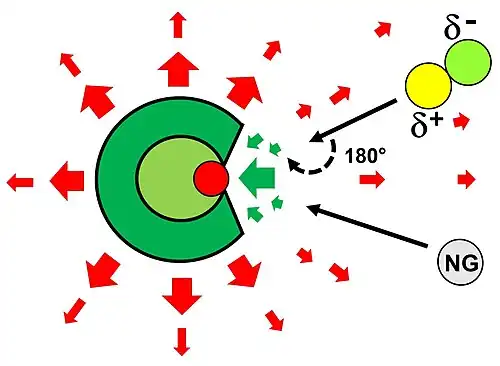 After the noble gas has been bound to the boron atom, its substitution by a nucleophile in a typical SN2 reaction is prevented by the cage structure of the borate, since the noble gas-boron bond is shielded sterically (cf. Fig. 6).[1]