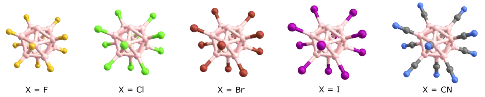 | [B12F11]– | [B12I11]– | [B12Cl11]– | [B12Br11]– | [B12(CN)11]– | |