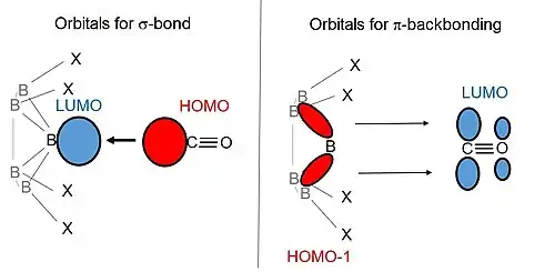 The binding of the diatomic molecules CO and N2 to superelectrophilic anions was studied using mass spectrometry, infrared photodissociation (IRPD) spectroscopy, and theoretical calculations. CO binds to the vacant boron atom of the electrophilic anion via its nucleophilic carbon. However, in contrast to the reaction with noble gases, the binding does not occur only through a σ-bonding of the nucleophile's CO and N2. The electrophilic anion pushes electron density into the antibonding π-orbitals of N2 and CO via π-backbonding, which further strengthens the bond to the electrophilic anion.[3]