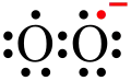 Lewis structure of superoxide. The six outer-shell electrons of each oxygen atom are shown in black; one electron pair is shared (middle); the unpaired electron is shown in the upper-left; and the additional electron conferring a negative charge is shown in red.