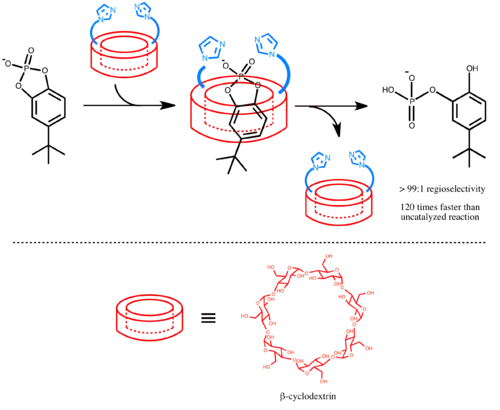 From the early 1970s, cyclodextrins have been extensively studied for its encapsulation properties and used as binding sites in supramolecular catalyst.[2] Cyclodextrins have rigid ring structure, hydrophilic surface, and hydrophobic cavity on the inside; therefore, they are capable of binding organic molecules in aqueous solution. In 1978, with the background knowledge that the hydrolysis of m-tert-butylphenyl acetate is accelerated in the presence of 2-benzimidazoleacetic acid and alpha-cyclodextrin,[8] Brewslow et al. developed a catalyst based on a beta-cyclodextrin carrying two imidazole groups. This cyclodextrin catalytic system mimics ribonuclease A by its use of a neutral imidazole and an imidazolium cation to selective cleave cyclic phosphate substrates. The rate of the reaction is catalyzed 120 times faster, and unlike a hydrolysis by simple base NaOH that gives a 1:1 mixture of the products, this catalysts yield a 99:1 selectivity for one compound.[4]