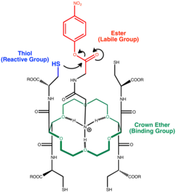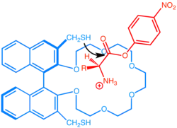The term supramolecular chemistry is defined by Jean-Marie Lehn as "the chemistry of intermolecular bond, covering structures and functions of the entities formed by association of two or more chemical species" in his Nobel lecture in 1987,[5] but the concept of supramolecular catalysis was started way earlier in 1946 by Linus Pauling when he founded the theory of enzymatic catalysis in which rate acceleration is the result of non-covalent stabilization of the transition state by the enzymes.[6] Nevertheless, it was not until a few decades later that an artificial enzyme was developed. The first simple enzyme mimics were based on crown ether and cryptand.[7] In 1976, less than ten years after the discovery of crown ether, Cram et al. developed a functionalized binapthyl crown ether that catalyze transacylation.[3] The catalyst makes use the crown ether motif's ability to capture cation to bind to the ammonium ion part of the substrate and subsequently employs the nearby thiol motif to cleave the ester.