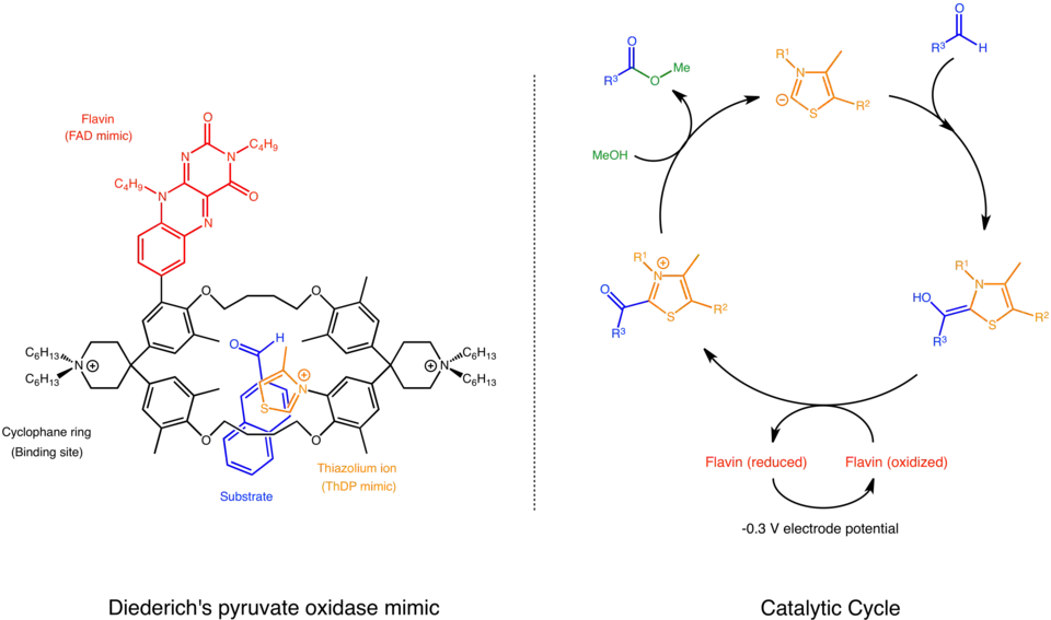 This biological system inspired the design of a supramolecular catalyst based on cyclophane. The catalyst has thiazolium ion, a reactive part of ThDP and flavin, a bare-bones core of FAD, in close proximity and near the substrate binding site. The catalytic cycle is almost the same as that in nature, except the substrate is an aromatic aldehyde rather than pyruvate. First, the catalyst binds the substrate within its cyclophane ring. Then, it uses thiazolium ion to condense with the substrate generating an active aldehyde. This aldehyde is oxidized by flavin and then attacked by methanol to yield a methyl ester.[24]