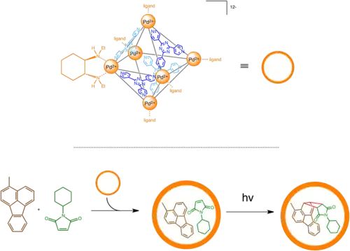 Fujita and coworkers discovered a self-assemble M6L4 (6 palladium ions and 4 ligands in each complex) supramolecular container that could be enhanced into a chiral supramolecule by an addition of peripheral chiral auxiliary. In this case, the auxiliary diethyldiaminocyclohexane does not directly activate the catalytic site but induces a slight deformation of the triazine plane to create chiral cavity inside the container molecule. This container could then be used to asymmetrically catalyze a [2+2] photoaddition of maleimide and inert aromatic compound fluoranthene, which previously have not been shown to undergo thermal or photochemical pericyclic reaction. The catalyst yields an enantiomeric excess of 40%.[27]