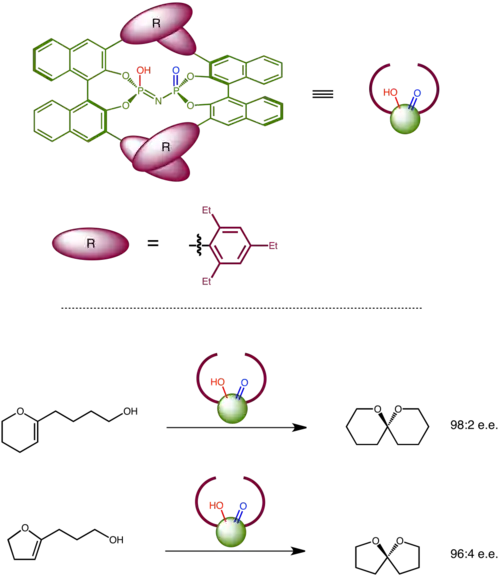 Enzymes also inspired a set of confined Bronsted acids within an extremely sterically demanding chiral pocket based on a C2-symmetric bis(binapthyl) imidodiphosphoric acid. Within the chiral microenvironment, the catalysts has a geometrically fixed bifunctional active site that activates both an electrophilic part and a nucleophilic part of a substrate. This catalyst enables stereoselective spiroacetal formation with high enantiomeric excess for a variety of substrates.[28]