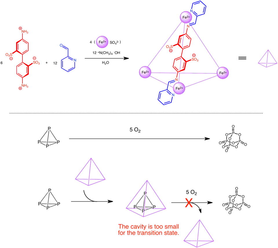 Nitschke and coworkers invented a self-assembly M4L6 supramolecular host with a tetrahedral hydrophobic cavity that can encapsulate white phosphorus. Pyrophoric phosphorus, which could self-combust upon contact with air, is rendered air-stable within the cavity. Even though the hole in the cavity is large enough for an oxygen molecule to enter, the transition state of the combustion is too large to fit within the small cage cavity.[29]