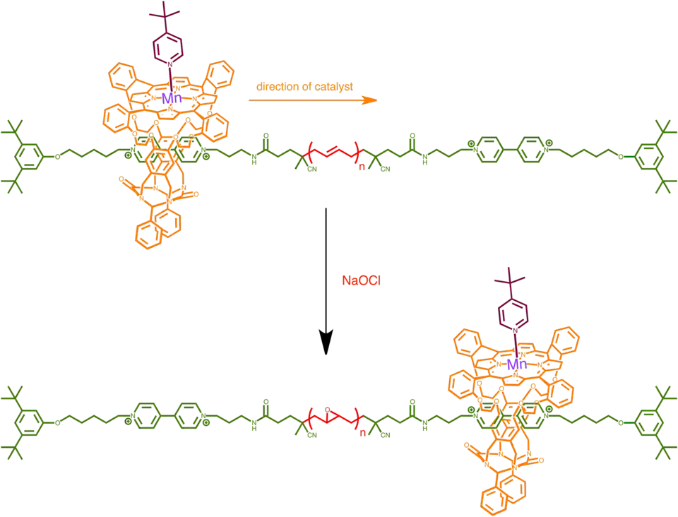 An artificial processive enzyme has been designed in a form of manganese porphyrin rotaxane that treads along a long polymer of alkene and catalyze multiple rounds of alkene epoxidation. Manganese (III) ion in the porphyrin is the molecule's catalytic center, capable of epoxidation in the presence of an oxygen donor and an activating ligand. With a small ligand such pyridine that binds manganese from inside the cavity of the rotaxane, epoxidation happens outside the catalyst. With a large bulky ligand such as tert-butyl pyridine that does not fit inside the cavity however, epoxidation happens on the inside of the catalyst.[25]