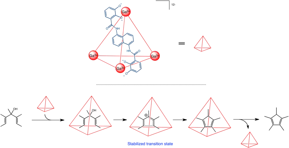A supramolecular host M4L6 (4 gallium ions and 6 ligands for each complex) self-assembles via metal-ligand interaction in aqueous solution. This container molecule is polyanionic and thus its tetrahedron-shaped cavity is capable of encapsulating and stabilizing a cationic molecule. Consequently, encapsulated molecule can be easily protonated as a resulting carbocation from protonation is stabilized by the surrounding anions. This container assists in acid-catalyzed Nazarov cyclizations. The catalyst accelerates the reaction by over one million fold, making it the most efficient supramolecular catalyst to date. It was proposed that such a high catalytic activity does not arise just from the increased basicity of the encapsulated substrate but also from the constrictive binding that stabilize the transition state of the cyclization. Unfortunately, this catalyst has a problem with product inhibition. To by pass that problem, the product of the cyclization reaction could be reacted with a dienophile transforming it into a Diels-Alder adduct that no longer fits inside the catalyst cavity.[26]