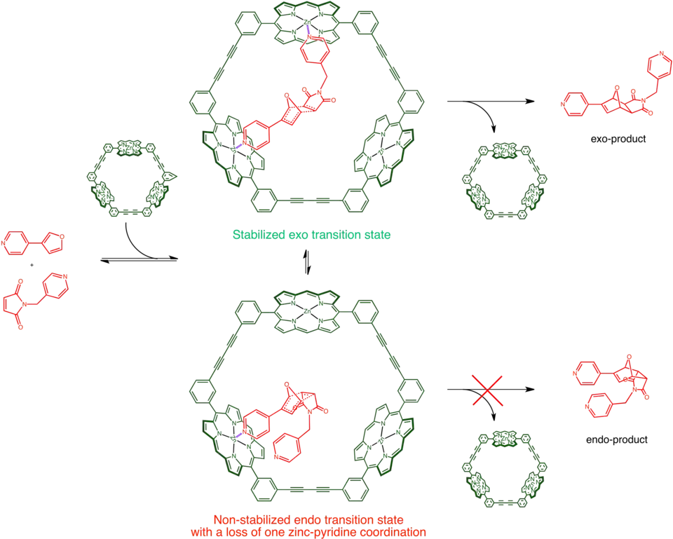 An example of catalysts of this type is Sander's porphyrin trimer. A Diels Alder reaction between two pyridine functionalized substrates normally yield a mixture of endo and exo products. In the presence of the two catalysts, however, complete endo selectivity or exo selectivity could be obtained. The underlying cause of the selectivity is the coordination interaction between pyridine and the zinc ion on porphyrin. Depending on the shape of the catalysts, one product is preferred over the other.[18]