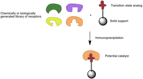 Assuming that catalytic activity largely depends on the catalyst's affinity to the transition state, one could synthesize a transition state analog (TSA), a structure that resembles the transition state of the reaction. Then one could link the TSA to a solid-support or identifiable tag and use that TSA to select an optimal catalyst from a mixture of many different potential catalysts generated chemically or biologically by a diversity oriented synthesis. This method allows quick screening of a library of diverse compounds. It does not require as much synthetic effort and it allows a study of various catalytic factors simultaneously. Hence the method could potentially yield an efficient catalyst that we could not have designed with our current knowledge.[19]