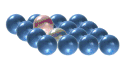 ![]() Figure 8. Cross-channel diffusion involving an adatom (grey) on a channeled surface (such as fcc (110), blue plus highlighted green atom). 1) Initial configuration; 2) "Dumbbell" intermediate configuration. Final displacement may include 3, 4, 5, or even a return to the initial configuration. Not to scale. |