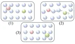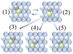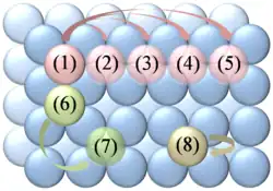 - Atomic exchange involves exchange between an adatom and an adjacent atom within the surface lattice. As shown in figure 4, after an atomic exchange event the adatom has taken the place of a surface atom and the surface atom has been displaced and has now become an adatom. This process may take place in both heterodiffusion (e.g. Pt adatoms on Ni) and self-diffusion (e.g. Pt adatoms on Pt). It is still unclear from a theoretical point of view why the atomic exchange mechanism is more predominant in some systems than in others. Current theory points towards multiple possibilities, including tensile surface stresses, surface relaxation about the adatom, and increased stability of the intermediate due to the fact that both atoms involved maintain high levels of coordination throughout the process.[14][15]