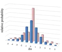 ![]() Figure 7. Graph showing relative probability distribution for adatom displacement,Δx, upon diffusion in one dimension. Blue: single jumps only; Pink: double jumps occur, with ratio of single:double jumps = 1. Statistical analysis of data may yield information regarding diffusion mechanism. | |
