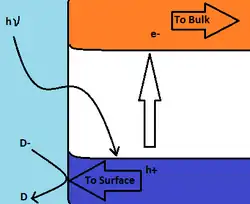 Near the surface of a semi-conducting metal oxide the valence and conduction bands are of higher energy, causing the upward bending of the band energy as shown in the band energy diagram, such that promotion of an electron from the valence band to the conduction band by light of energy greater than the band gap results in migration of the electron towards the bulk of the solid or to a counter electrode, while the hole left in the valence band moves towards the surface. The increased concentration of holes near the surface facilitates electron transfer to the solid, such as the example shown in the figure of the oxidation of redox couple D-/D.[2] In the absence of any mechanism to remove electrons from the bulk of the solid irradiation continues to excite electrons to the conduction band producing holes in the valence band. This leads to the reduction of the upward bending of the band energies near the surface, and the subsequent increase in excited electron availability for reduction reactions.[2]