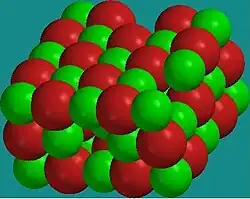 Many compounds from first row of transition metal monoxides (MO), from TiO to NiO, have a rocksalt structure. The rock salt structure[4] is generated by filling all octahedral sites with cations in an oxygen anion fcc array.[5][6]