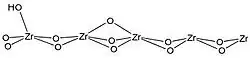 Zirconia exists in the monoclinic, tetragonal or cubic crystal system depending on the temperature. The surface acidity and basicity of the oxide depends on the crystal structure and surface orientation.[20] The surfaces of zirconia have hydroxyl groups, which can act as Brønsted acids or bases, and coordination-unsaturated Zr4+O2− acid base pairs which contribute to its overall acid–base properties.[20] Adsorption studies have shown that monoclinic zirconia is more basic than tetragonal, as it forms stronger bonds with CO2. Adsorption of CO shows that the tetragonal phase has more acidic Lewis acid sites than the monoclinic phase, but that it has a lower concentration of Lewis acid sites.[20]