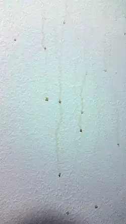 Surfactant leaching of acrylic (latex) paints, also known as exudate staining,[1] streak staining, streaking, weeping, exudation, etc., occurs when the freshly painted surface becomes wet and water-soluble components of the paint (dispersants, surfactants, thickeners, glycols, etc.) leach out of the paint in sticky brown streaks.[2][3] This may happen, e.g., due to rain or dew for exterior surfaces, or water vapor condensation on interior ones. On the external surfaces the streaks will normally weather off in several weeks, and removal of them before that time is impractical, especially because it may damage the paint before it is completely cured.[2] The streaking phenomenon may also be observed for some silicone sealants.[3]