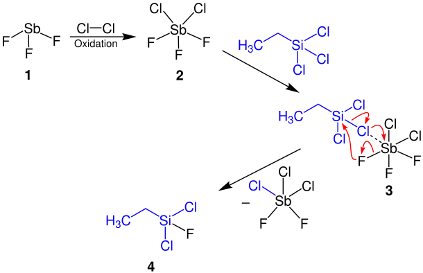 The active species is antimony trifluorodichloride 2, which is produced in situ from the reaction between antimony trifluoride 1 and chlorine; this compound can also be produced in bulk, according to a patent of John Weaver.[2] This then undergoes a halogen exchange with a haloalkane (here trichloroethylsilane), as in 3, replacing the halogen atom (here chlorine) with fluorine and affording the fluorinated product 4.[3]