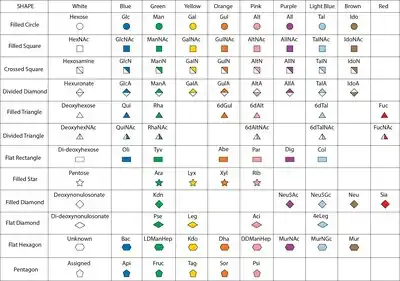 - ↑ Neelamegham, S; Aoki-Kinoshita, K; Bolton, E; Frank, M; Lisacek, F; Lütteke, T; O'Boyle, N; Packer, N; Stanley, P; Toukach, P; Varki, A; Woods, RJ; SNFG Discussion, group. (11 June 2019). "Updates to the Symbol Nomenclature For Glycans (SNFG) Guidelines". Glycobiology. 29 (9): 620–624. doi:10.1093/glycob/cwz045. PMC 7335484. PMID 31184695.