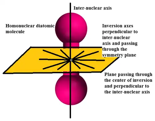 In addition to axial reflection symmetry, homonuclear diatomic molecules are symmetric with respect to inversion or reflection through any axis in the plane passing through the point of symmetry and perpendicular to the inter-nuclear axis.