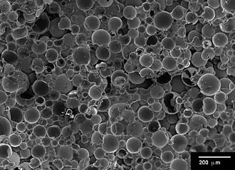 Syntactic foams are composite materials synthesized by filling a metal, polymer,[1] cementitious or ceramic matrix with spheres as aggregates.[2] The spheres may be hollow, called microballoons[3] or cenospheres, or non-hollow, for example perlite.[4] In this context, "syntactic" means "put together."[5] The presence of hollow particles results in lower density, higher specific strength (strength divided by density), lower coefficient of thermal expansion, and, in some cases, radar or sonar transparency.