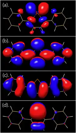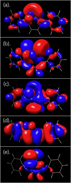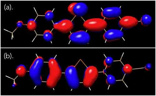 In 2017, Seferos et al. reported the oxidative ring opening of 2,5-diphenyltellurophene (PT) under aerobic conditions, and with meta-chloroperoxybenzoic acid (mCPBA).[21] Through DFT calculations, it was found that upon oxidation of PT, the resulting Te(IV) oxide PT-O had a lower HOMO level, with the LUMO being significantly stabilized. This led to a large decrease in the HOMO-LUMO energy gap, which predicted a red shift in the maxima of the absorption spectrum. Furthermore, it was found that the electron density of the LUMO included a Te-O σ* orbital. This orbital picture has been further reproduced using Avogadro and GAMESS, as shown on the orbital diagram below.[16][17]