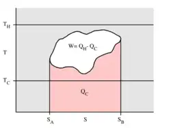 Example T–s diagram for a thermodynamic cycle taking place between a hot reservoir (TH) and a cold reservoir (TC).