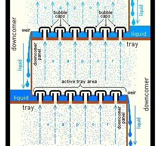 An example of a very simple tray is a perforated tray. The desired contacting between vapor and liquid occurs as the vapor, flowing upwards through the perforations, comes into contact with the liquid flowing downwards through the perforations. In current modern practice, as shown in the adjacent diagram, better contacting is achieved by installing bubble-caps or valve caps at each perforation to promote the formation of vapor bubbles flowing through a thin layer of liquid maintained by a weir on each tray.