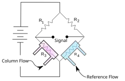A schematic of a classic thermal conductivity detector design utilizing a Wheatstone bridge circuit is shown. The reference flow across resistor 4 of the circuit compensates for drift due to flow or temperature fluctuations. Changes in the thermal conductivity of the column effluent flow across resistor 3 will result in a temperature change of the resistor and therefore a resistance change which can be measured as a signal.
