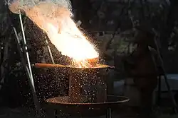 Apart from magnesium ignition, some amateurs also choose to use sparklers to ignite the thermite mixture.[35] These reach the necessary temperatures and provide enough time before the burning point reaches the sample.[36] This can be a dangerous method, as the iron sparks, like the magnesium strips, burn at thousands of degrees and can ignite the thermite, though the sparkler itself is not in contact with it. This is especially dangerous with finely powdered thermite.